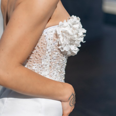 A one-of-a-kind short strapless wedding dress, handmade in France. Featuring a sleek pencil cut and hand-embellished with pearls, crystals, and floral appliqués – perfect for modern, elegant brides.