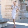 Step into timeless elegance with this modest lace wedding dress, featuring a flattering pencil silhouette that gracefully enhances your natural shape. Designed with delicate 3/4-length sleeves, this gown blends tradition with contemporary charm.