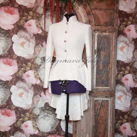 Asymmetrical ivory blazer with pleated peplum, collar officier, long sleeves, golden boutons, made to order and measure in France