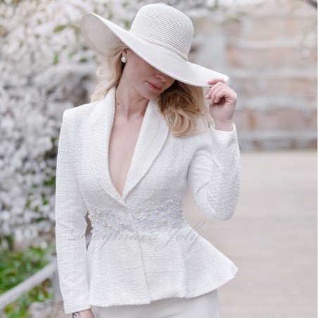 White fit and flare tweed bridal blazer with shawl collar and pearl embellishments , One of a kind made in France.