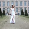 A sleeveless wedding dress with a high slit, V-back, lace and crystal embellishments, and a flowing train—handcrafted in France for the bold, modern bride.