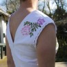 This midi-length linen embroidered wedding dress blends vintage charm with modern craftsmanship. Designed with a romantic heart neckline and delicately embroidered details, this dress is ideal for brides seeking something both sustainable and stunning.
