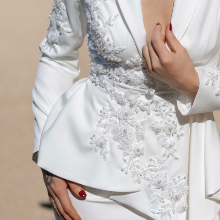 Cet tailleur de mariée est réalisée uniquement sur commande et ajustée selon vos mesures personnalisées.