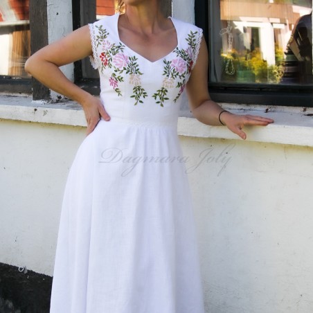 Cette pièce unique met en valeur un décolleté cœur romantique, une jupe midi fluide et de délicates broderies faites à la main qui soulignent subtilement la silhouette. Confectionnée dans un lin naturel et respirant, elle est idéale pour un mariage civil, un elopement, une cérémonie en plein air ou un style bohème raffiné.