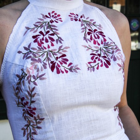 Robe de mariée mi-longue en lin naturel, avec broderies artisanales et col halter structuré et emmanchure américaine.